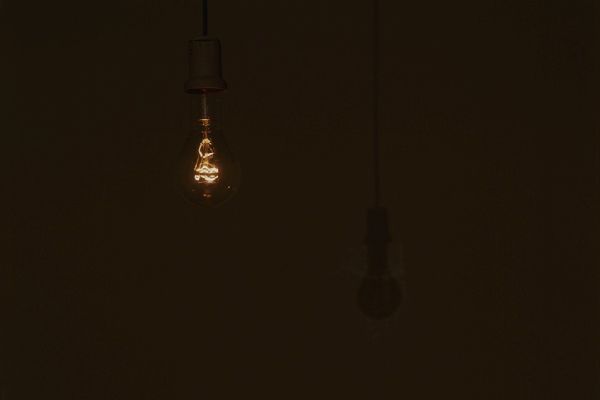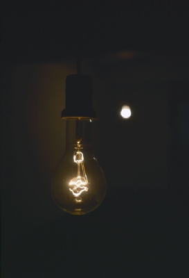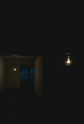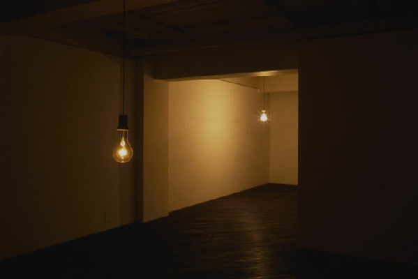 I installed two big clear bulbs. One was suspended at an eye level and the other was suspended at a far lower level to create a closer relationship to the ground. I programmed the light glimmering with a lighting technician. Sometimes there was no light in the space, but then one light started to glimmer slightly and went off slowly. The other light started to light up and down independently responding to the other one. All this glimmering rhythm was based on our breathing rhythm.