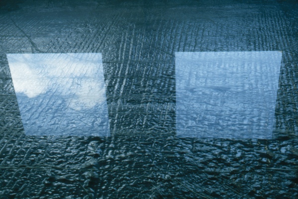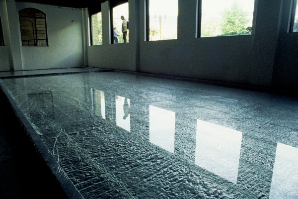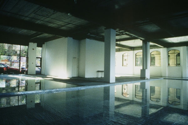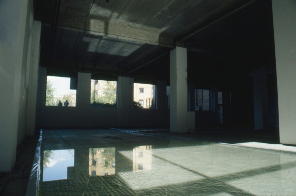 passers-by in reverie. The pressure of water on a sheet of clear polythene beneath, revealed the texture of the concrete introducing a visual tension. The notion of connectivity was suggested by the apparent unity of the water with the surface of the concrete. The mirroring of structure, windows and street life, imported a drama to the barren interior space.”
