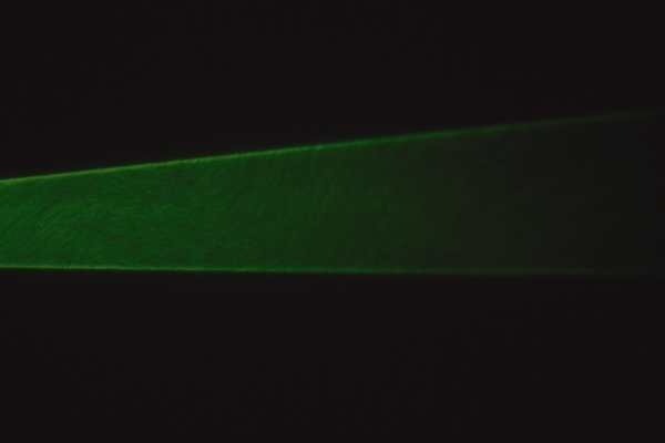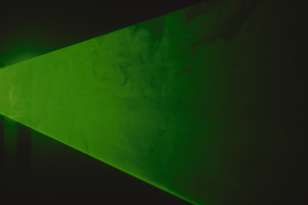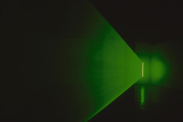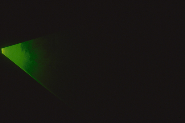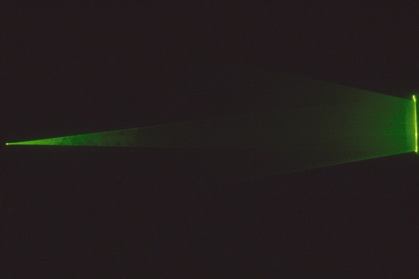 With the curatorial collaboration of Artspace director Nicholas Tsoutas, Aoyagi considered the possibilities. The work was to be sited on the lower floor of the huge old warehouse with timber columns and a complex ceiling structure. Her first inclination was to use the intense daylight, but the summer sun is high in the sky over Australia and the windows were low in the building so the trajectory of the suns rays actually brought little light into the space. The resolution was to use a green beam laser. The knife of green light dissected the space, was then bent diagonally by a mirror to focus in an intense vertical strip on the facing wall. A cloud of haze swirled through the laser beam giving it an organic texture. The bustling atmosphere of the outside world would enter the contemplative space within the viewers consciousness. Aoyagi takes the pragmatic view that the use of natural or artificial light depends upon what is appropriate to each situation.”
