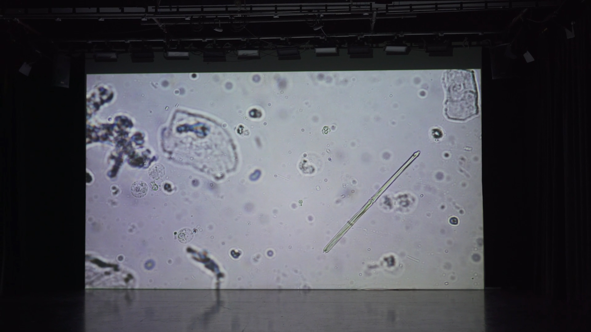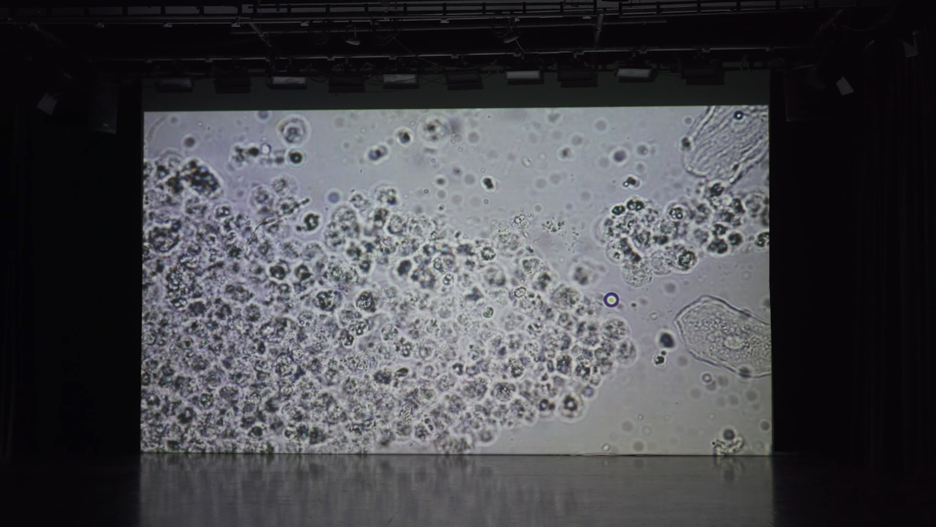 The debris of bones are floating amongst the light creatures in the saliva. The sound was created to transmit space/time far away by playing singing bowls.