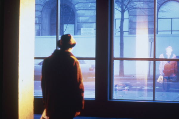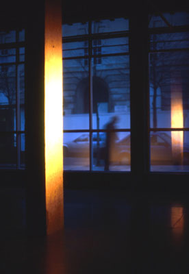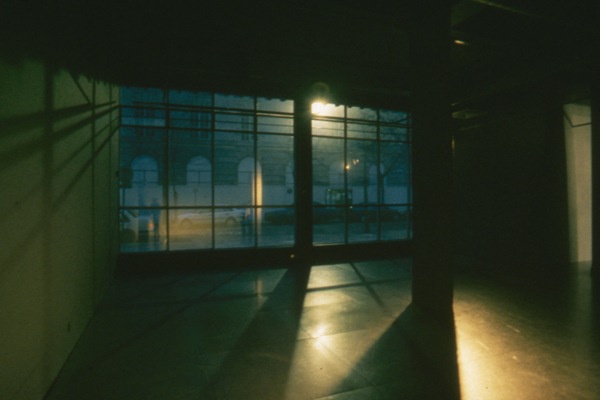 Light is the operative element, holding the work static at midday and developing its own particular twilight of continuous change during the afternoon and evening. As the street darkens and reflections in the window solidify and become defined, you witness your own presence in the space. Simultaneously, the reflection of the pillar intensifies beyond the window until people passing on the pavement appear to walk through it. As the surfaces within alter, the grey around the window becomes so deep as to look softly absorbent: other walls lose precise location, and one’s position in the space can no longer be verified by the usual perceptual norms. The gallery floor, reflected beyond the window, appears to leave one’s feet without support. In the street outside people pass, maybe quickly glancing at their image in the mirrored window, unaware that they have become part of the work.”